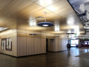 Designed with large wood panels in mind, the 9Wood XL Channel Tile wood ceiling offers a floating tiled appearance. The 4500 style installs progressively using perimeter extrusion clips (XL Channel). Minimum reveals are 3/8″ typ., permitting a concealed suspension.