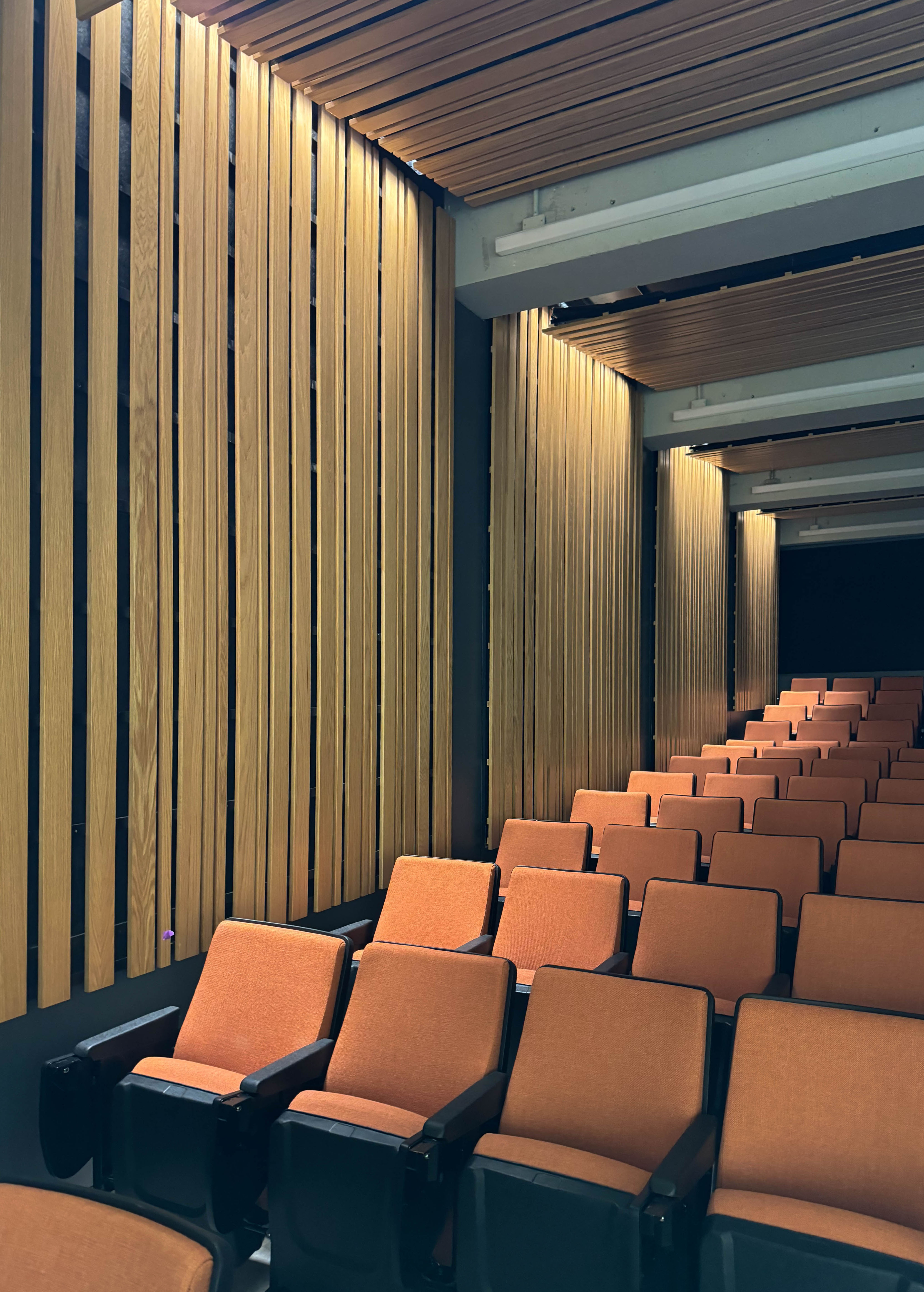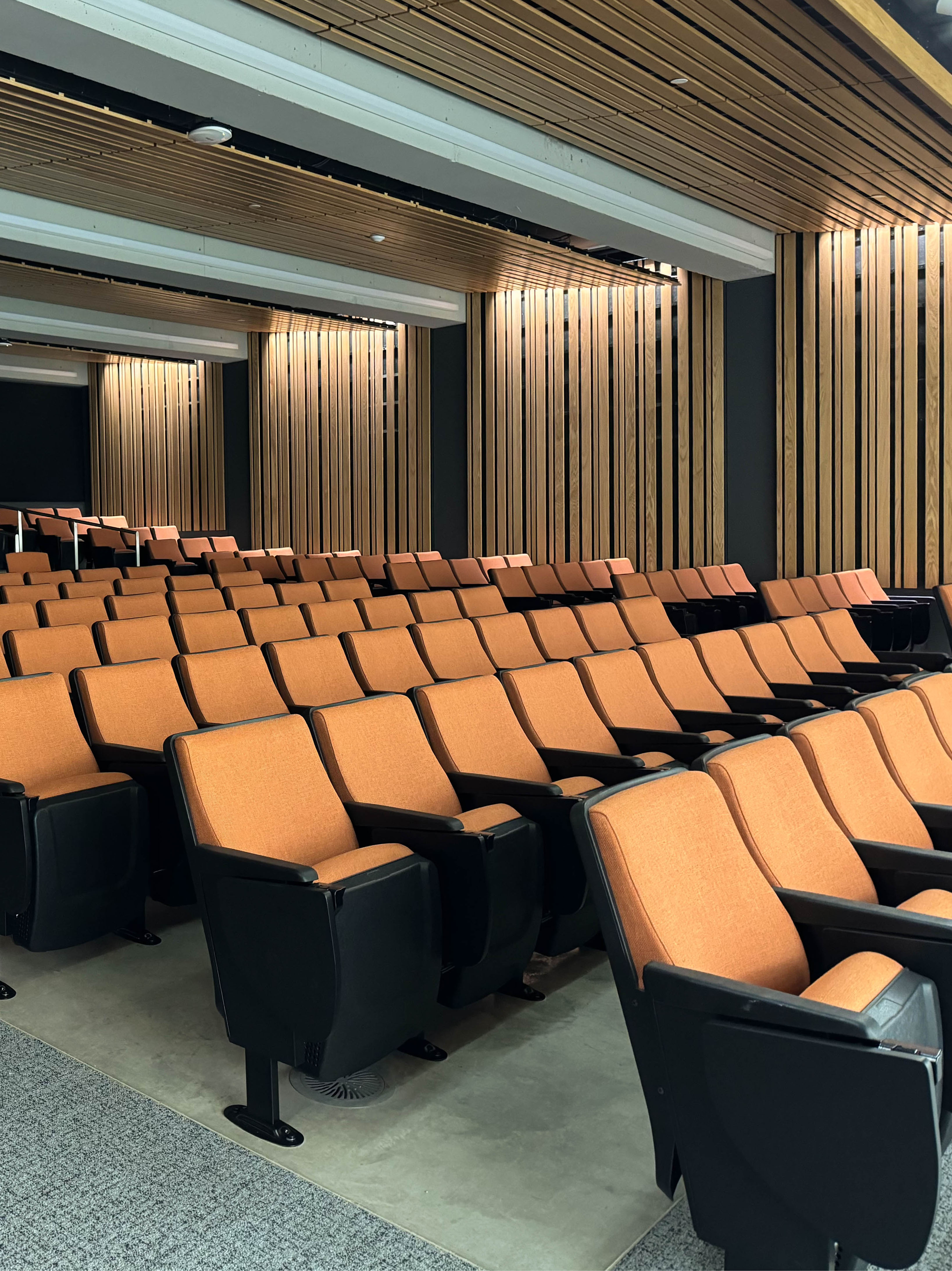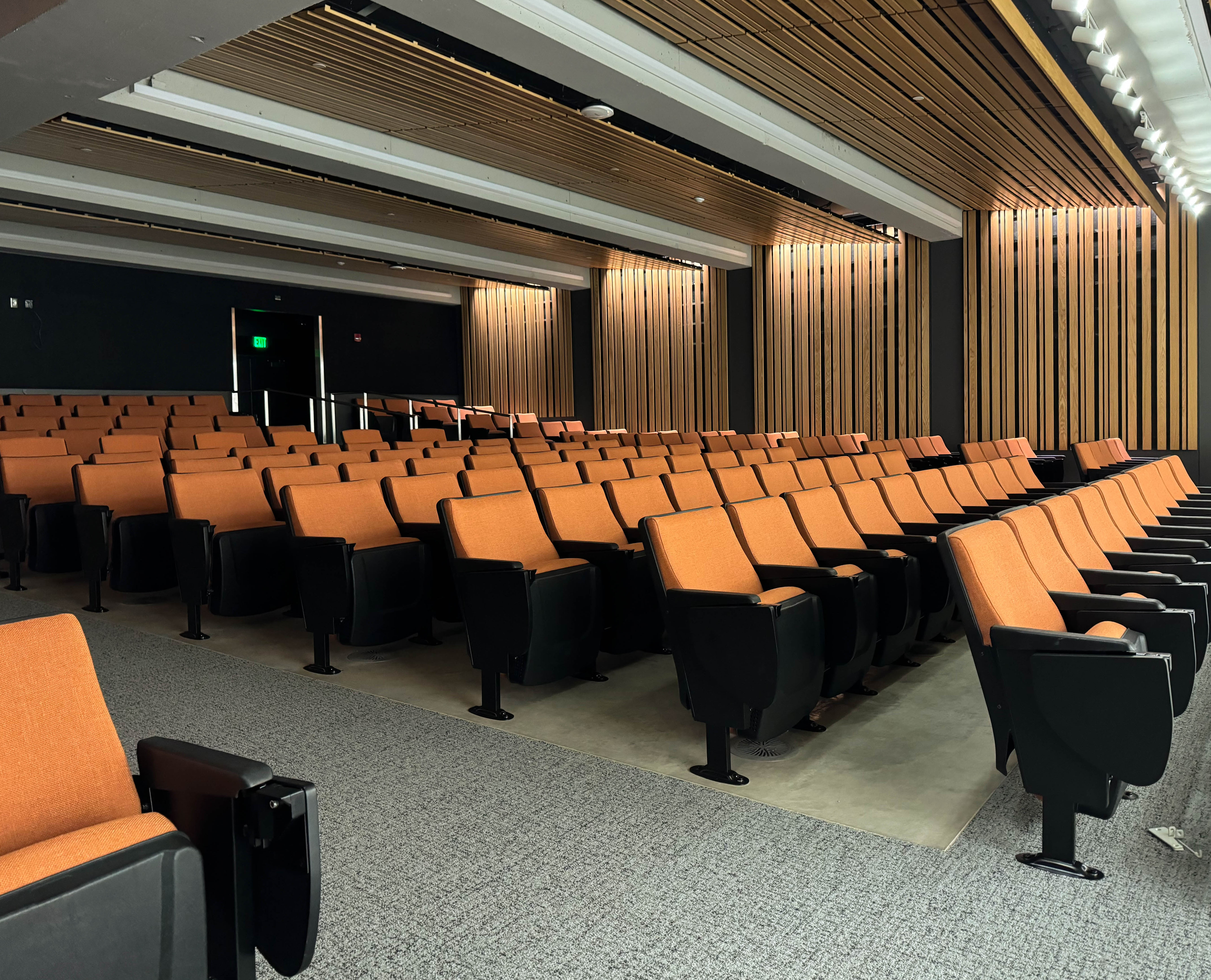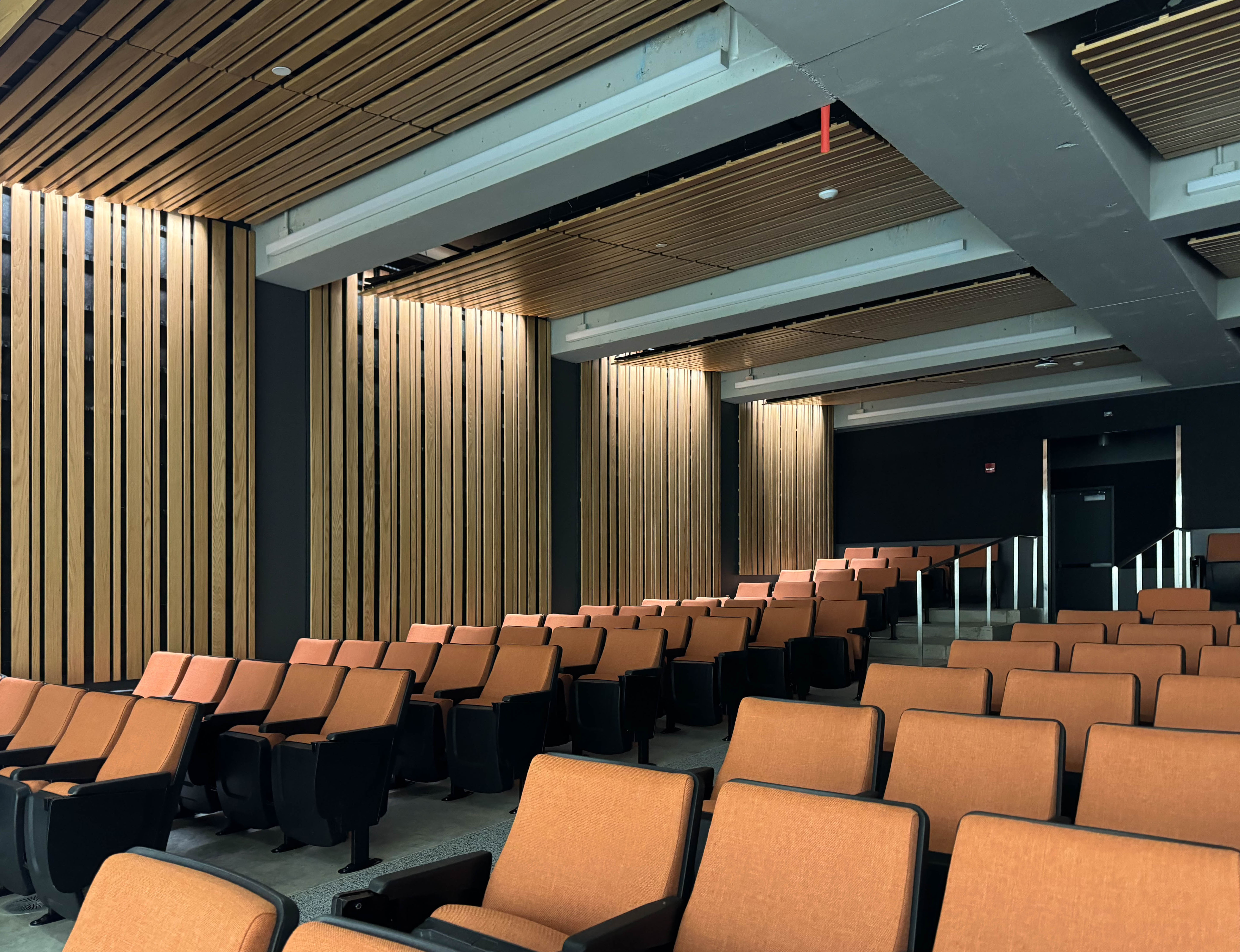 The wood ceiling at Cordley hall does more than cover the ceiling. Walking down the walls, this hybrid panel wood ceiling brings warmth and biophilic design to the auditorium at Cordley hall.