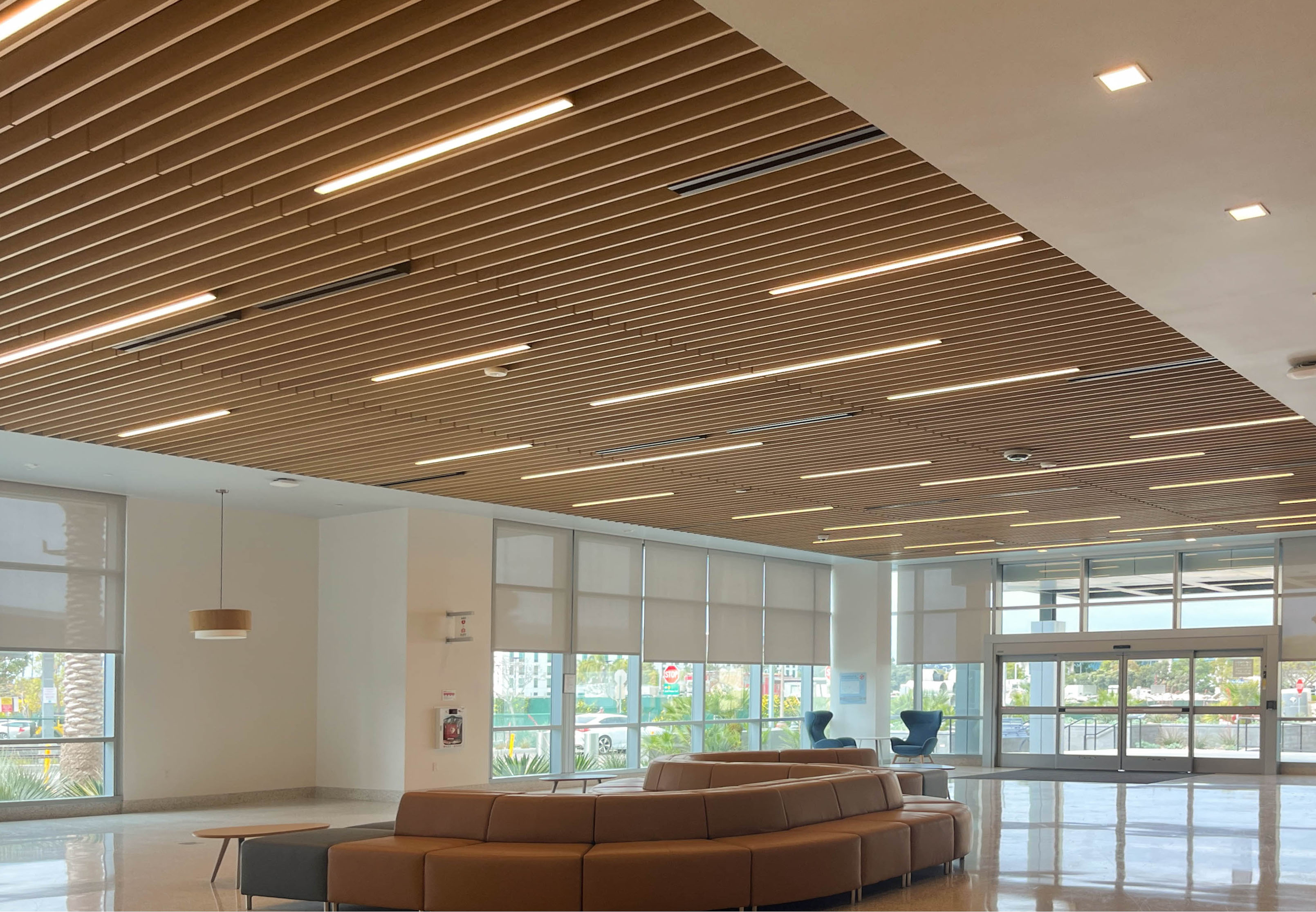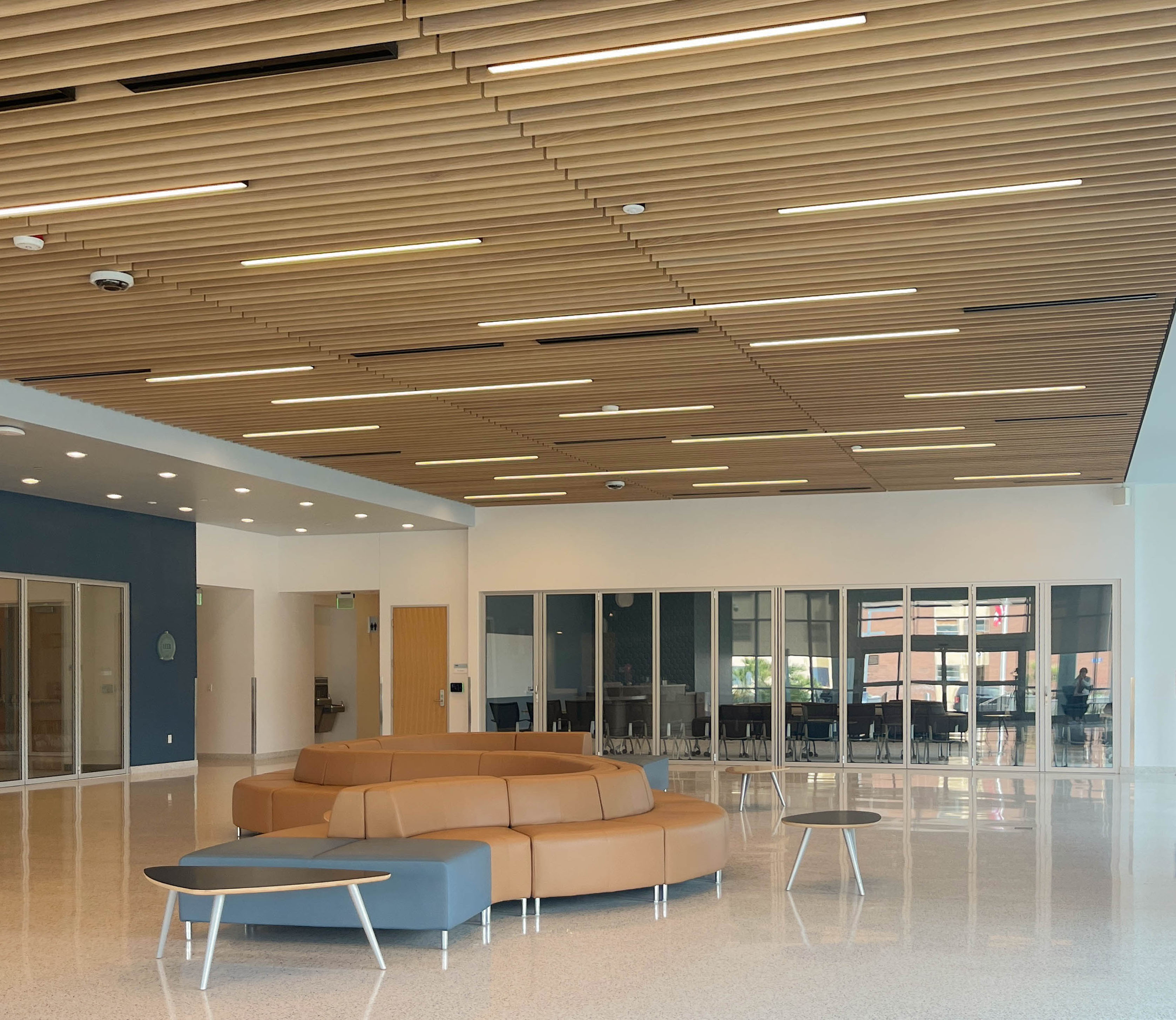 The wood ceilings not only brought warmth and biophilic design trends to the common areas but helped this building achieve LEED Gold certification.
